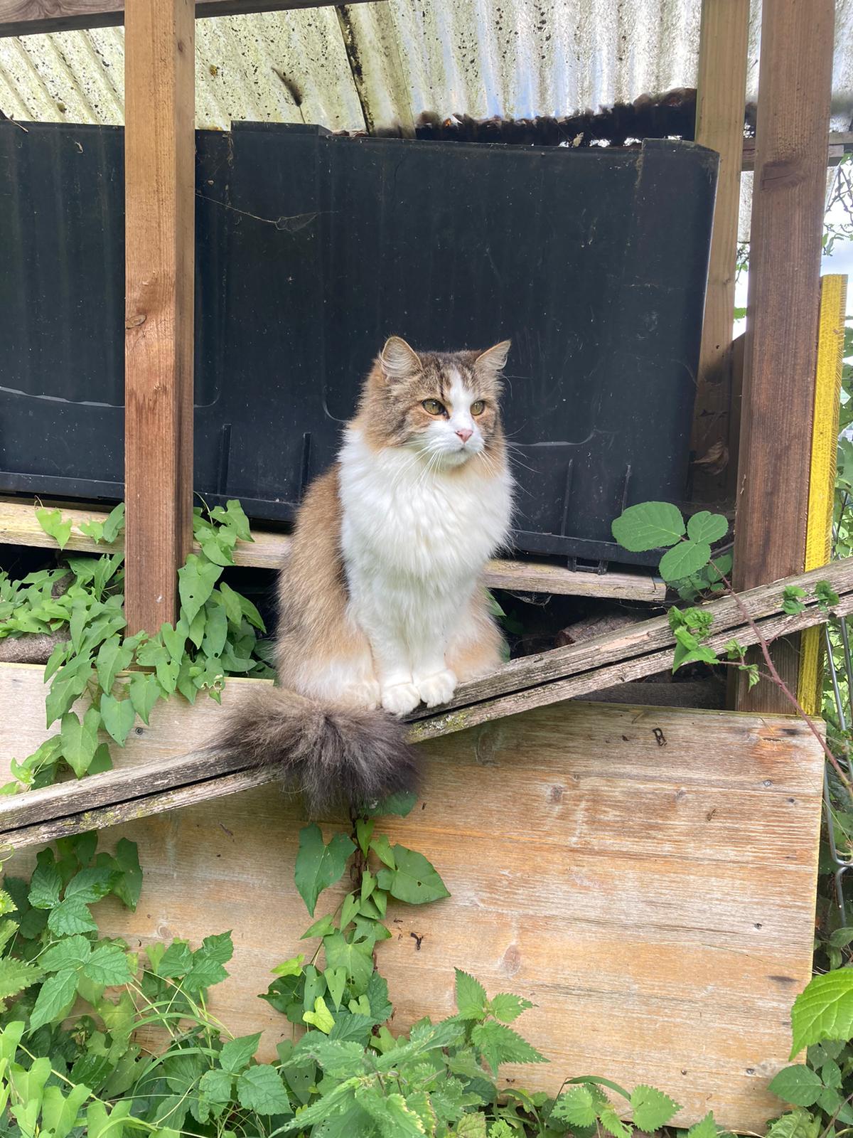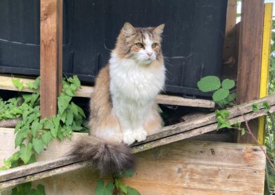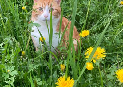 Im Winter 2019 erkrankte das Käterli Rumi. Er kam morgens nicht wie gewohnt zum Frühstück, und ich rief und suchte ihn den ganzen Vormittag. „Nein, ich gehe nicht zur Probe, bis ich Rumi gefunden habe.“ Plötzlich torkelte er aus einer dunklen Ecke hervor. Sofort ab zum Tierarzt, wo er vier Tage und Nächte bleiben musste. Anschliessend nahmen wir ihn ins warme Haus, und ich pflegte ihn, bis er wieder zu Kräften kam. Seither schläft er im Winter bei uns im Haus. Zwei Jahre später kam sein Zwillingsbruder Schamsi dazu, da er ebenfalls an einem Infekt erkrankte. Manucci und Biggs teilten tapfer ihr Heim mit den beiden roten Tigerli – danke euch!Da Biggs nach einer unheilbaren Krankheit im November 2023 zu unserer grossen Trauer verstarb, leben heute Manucci, Rumi und Schamsi als Freigänger im Haus, und acht Halbwilde im Stall und draussen in der schönen Natur. Diese sind: Giovi, Mama Clochy mit Lani, Finäli, Reza und Musil, Sufi, die Tochter von Häxli, und Bobitsch, der vor drei Jahren zugelaufene Kater. Manchmal stopft sich auch ein wilder Kater, The Tiger, im Winter bei uns den Bauch voll.
